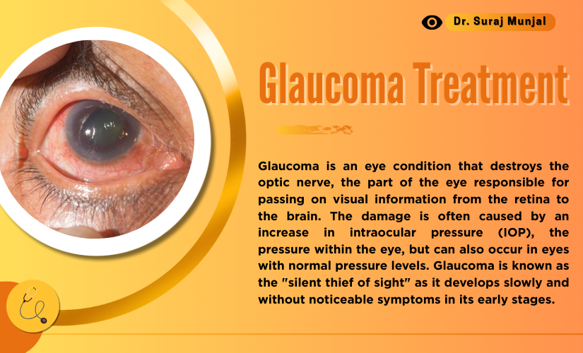 Glaucoma is an eye condition that destroys the optic nerve, the part of the eye responsible for passing on visual information from the retina to the brain. The damage is often caused by an increase in intraocular pressure (IOP), the pressure within the eye, but can also occur in eyes with normal pressure levels. Glaucoma is known as the "silent thief of sight" as it develops slowly and without noticeable symptoms in its early stages.